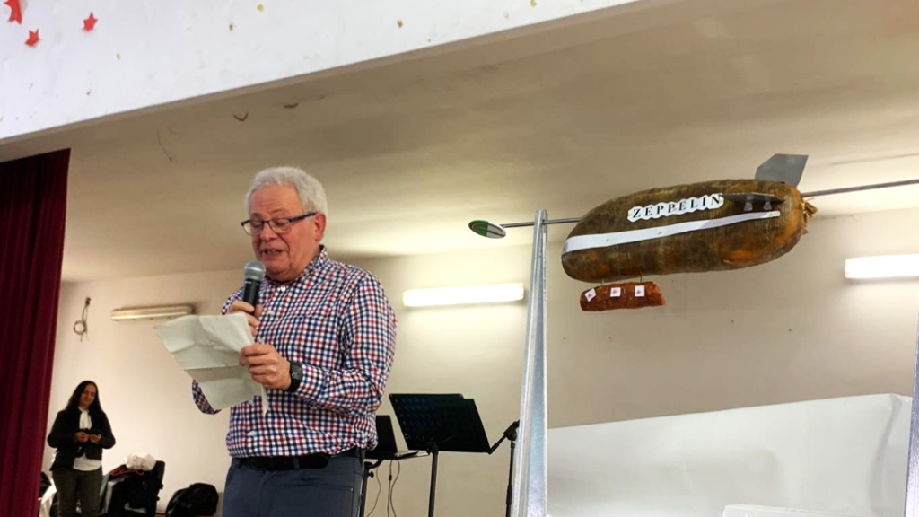 Während dieser Zeit sorgte Hans Janzer (Vorsitzender der HOG Sanktandres) mit seinem Zeppelin für die Attraktion des Tages, indem er die 111-jährige Luftfahrtgeschichte aller Banater hinwies und das aus Schweinefleisch gefertigte Flugobjekt enthüllte.