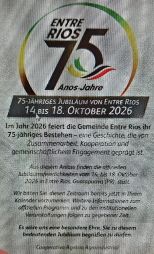 Vom 9. Oktober bis zum 24. Oktober 2026 soll es eine besondere Reise werden. In Planung ist ein 3-tägiger Aufenthalt in Rio de Janeiro mit Erholung am Strand, Stadtrundfahrt, Zuckerhut, eventuell eine Besichtigung des letzt erhaltenen Zeppelin-Hangars usw. In Curitiba-Foz do Iguaçu gibt es die Wasserfälle auf brasilianischer und argentinischer Seite zu sehen. Der Höhepunkt dürfte wohl die 75-jährige Jubiläumsfeier der Gemeinde Entre Rios der Donauschwaben in Brasilien sein.